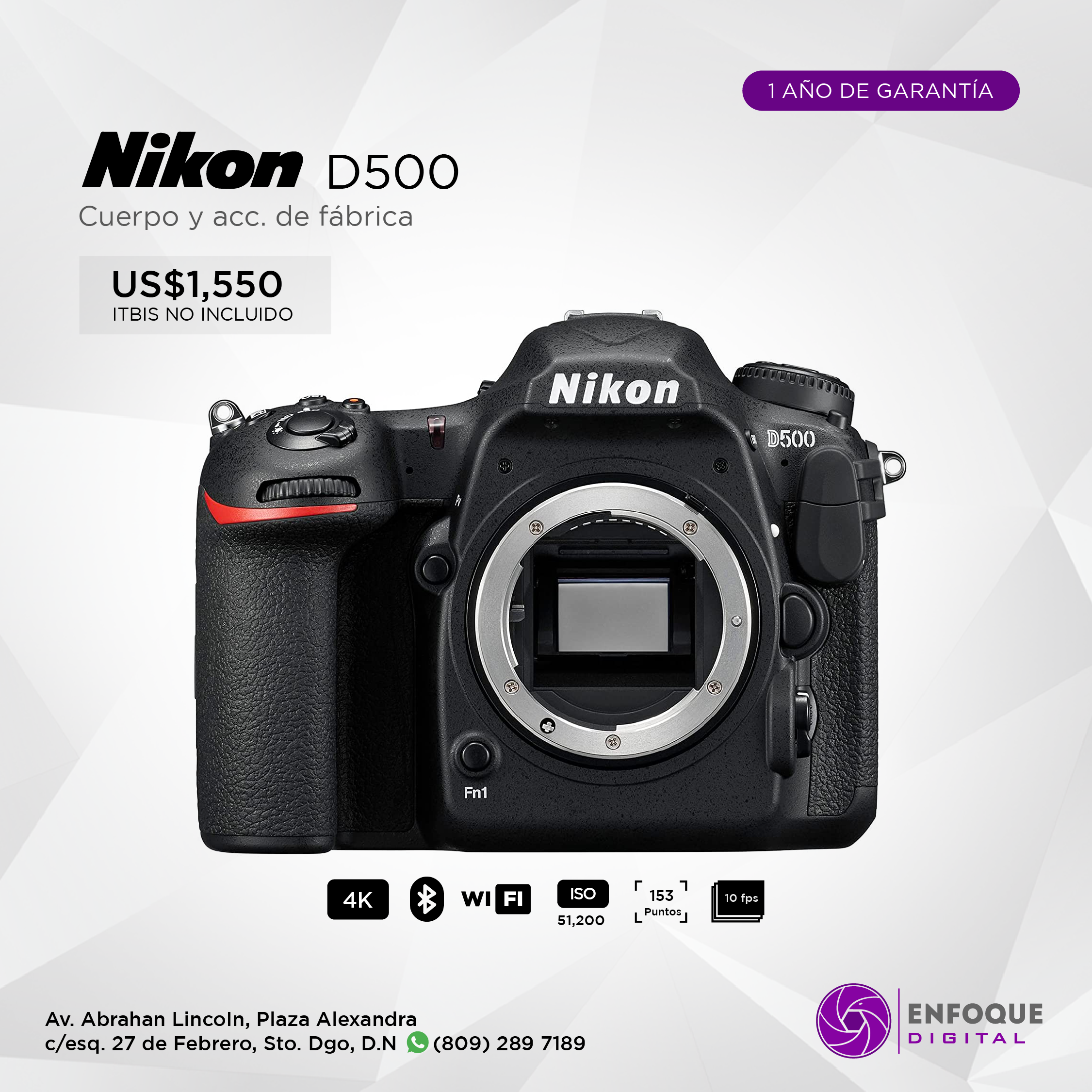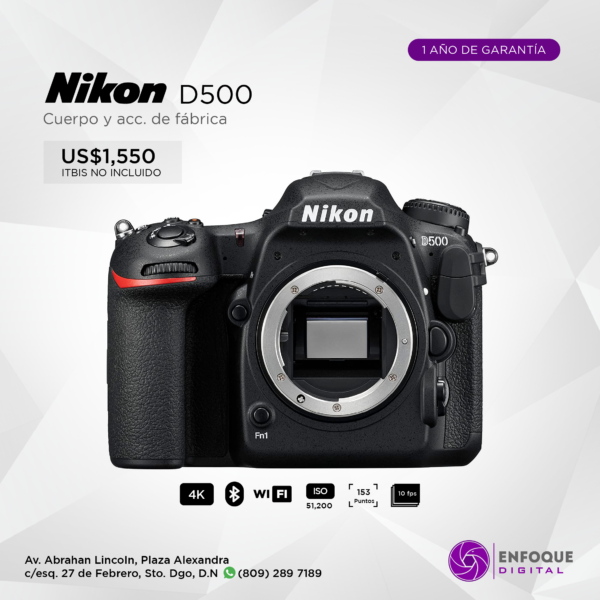 Como modelo insignia dentro de la línea DSLR de formato DX de Nikon, la D500se caracteriza por su construcción física robusta, capacidades de imagen adecuadas y, por supuesto, un factor de forma más compacto y elegante que sus hermanos FX. Girando alrededor de un sensor CMOS de 20.9MP y un procesador de imagen EXPEED 5, esta cámara atrae tanto a los fotógrafos como a los que disparan videos con su rápida velocidad de disparo continuo de 10 fps y sus capacidades de grabación de video 4K UHD.